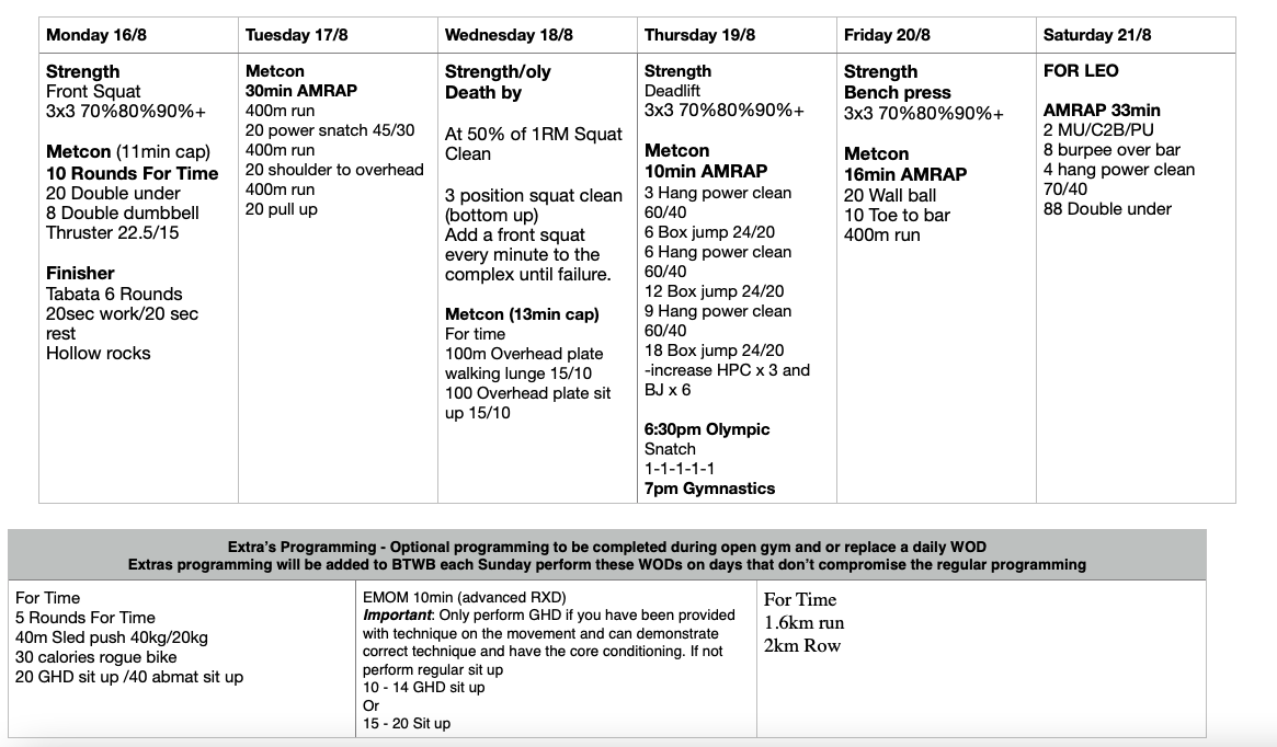 For the next 2 weeks we will be testing our 1RM lifts. We will be trialing a new strength program after testing. Therefore it is important you attend all the days the 1RM lifts are programmed. IF you miss a day pls aim to complete the 1RM test during open gym at a time that suits your schedule. More information on the new strength program coming soon.